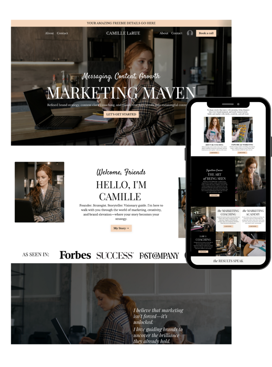 Both packages include the complete Camille website, Canva brand files, and royalty-free images. The Full Suite adds every funnel page you need to grow your list and fill your programs.