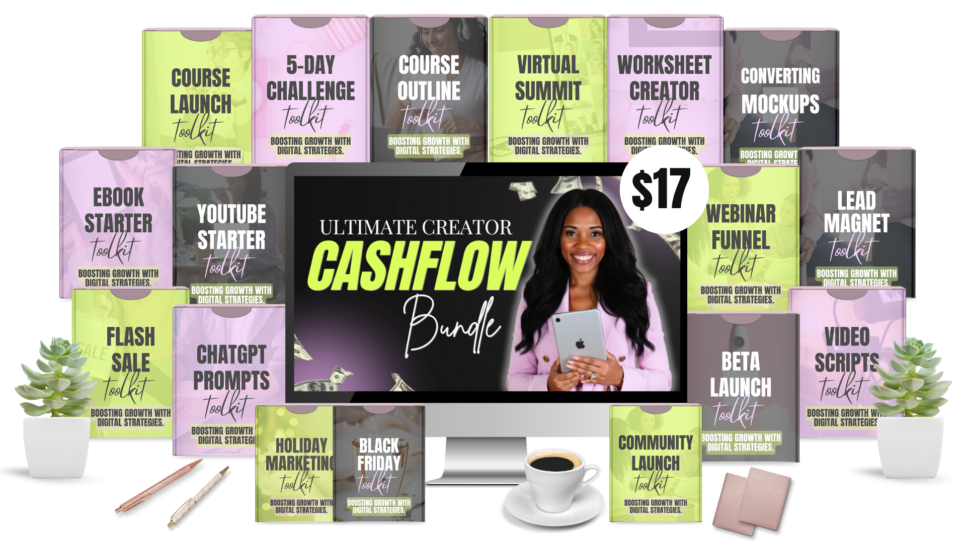 Get 17 plug-and-play toolkits, templates, and systems to help you plan, create, launch, and sell your digital products with ease.